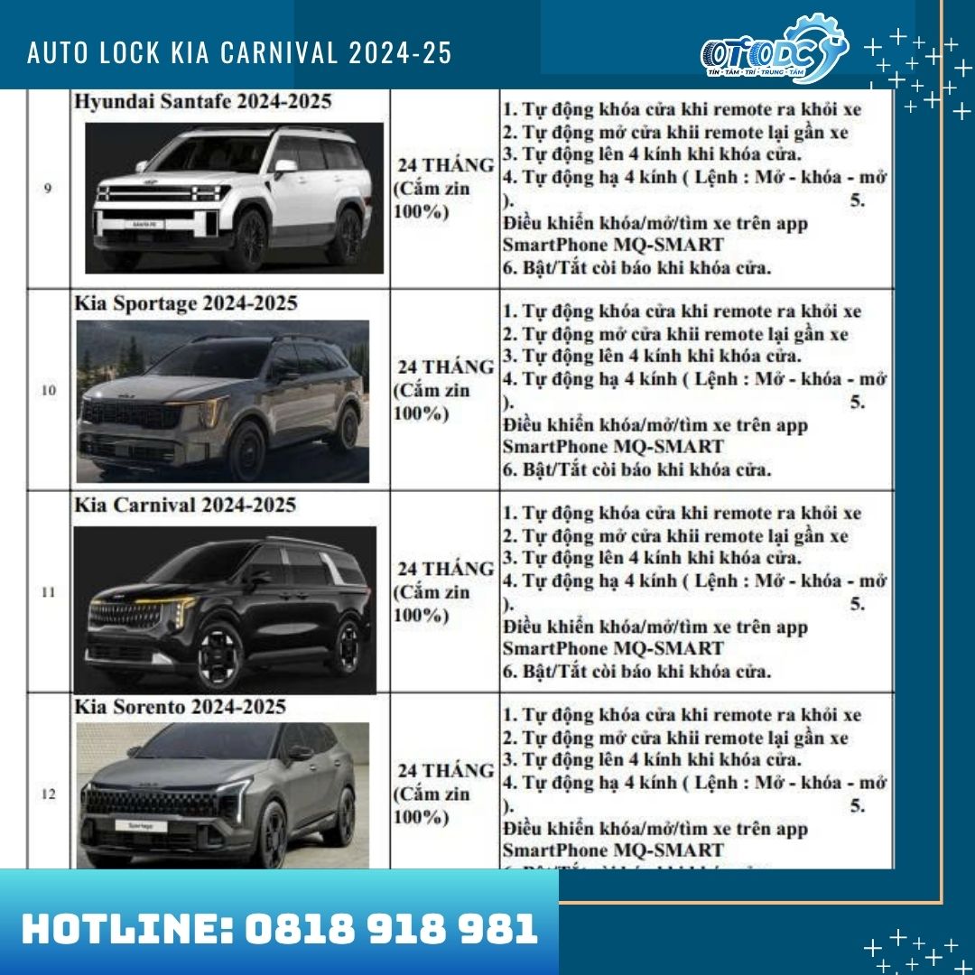 Auto Lock dành cho KIA Carnival 2024 – 2025 là giải pháp nâng cấp thông minh giúp chiếc xe trở nên tiện nghi, an toàn và hiện đại hơn. Hệ thống được thiết kế theo tiêu chuẩn zin của xe, tích hợp nhiều tính năng tự động thông minh, giúp người dùng sử dụng xe dễ dàng hơn trong mọi tình huống. Không chỉ mang lại sự tiện lợi trong quá trình sử dụng, Auto Lock còn góp phần tăng cường khả năng bảo vệ xe, hạn chế các rủi ro như quên khóa cửa hoặc quên đóng kính khi rời khỏi xe.