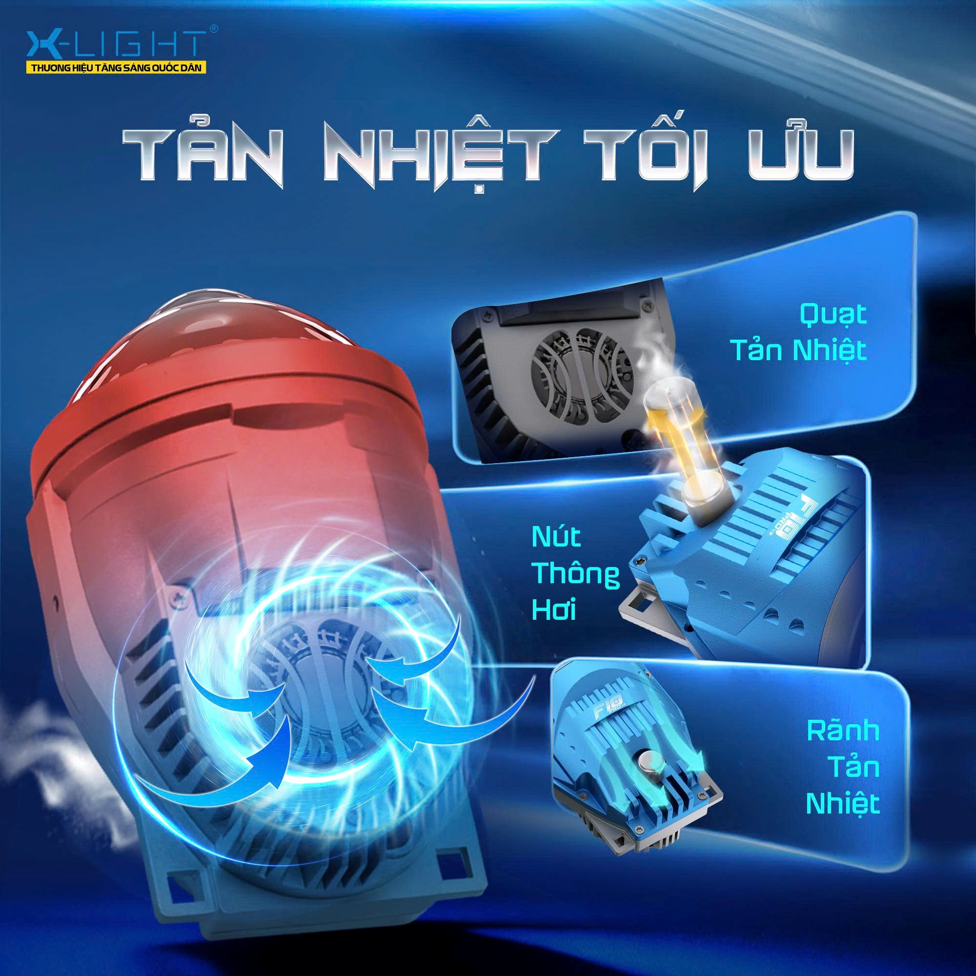 Để nâng cao độ bền và hiệu suất vận hành, X-Light F10 Pro V2 được trang bị quạt tản nhiệt độc lập đặt ở phía sau thân đèn. Nhờ cơ chế làm mát chủ động, quạt vẫn hoạt động hiệu quả ngay cả khi xe di chuyển chậm hoặc dừng chờ đèn đỏ khi đây là những tình huống dễ gây tích nhiệt. Thiết kế quạt rời còn giúp việc bảo dưỡng, thay thế trở nên đơn giản và tiết kiệm chi phí, khi người dùng không cần phải thay toàn bộ cụm đèn.